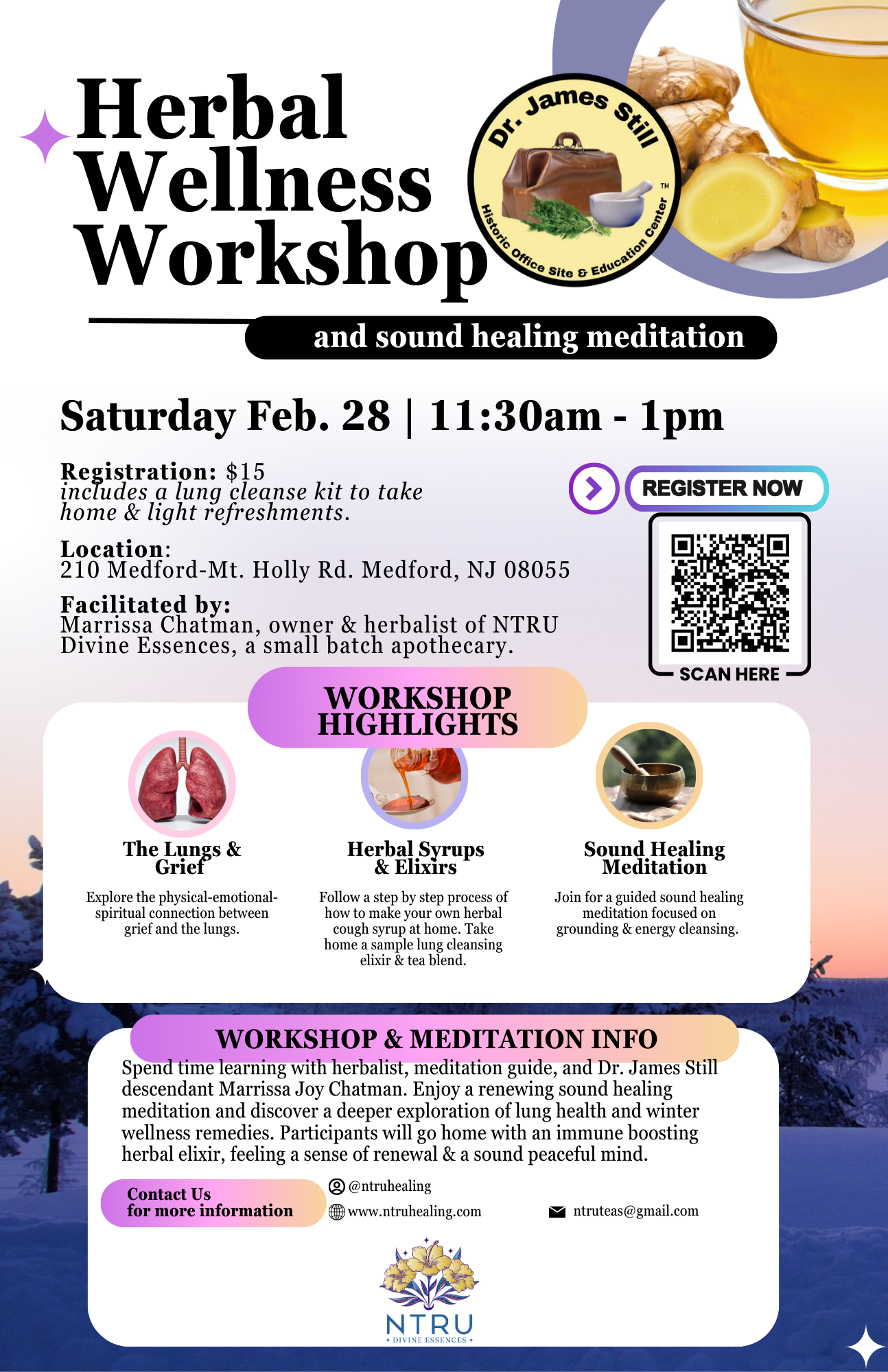 Spend time learning with herbalist, meditation guide, and Dr. James Still descendant, Marrissa Joy Chatman. Enjoy a renewing sound healing meditation and discover a deeper exploration of lung health and winter wellness remedies. Participants will go home with an immune boosting herbal elixir. Workshop registration is $15. Please contact ntruteas@gmail.com with any inquiries and use the following link to register: Wellness Workshop